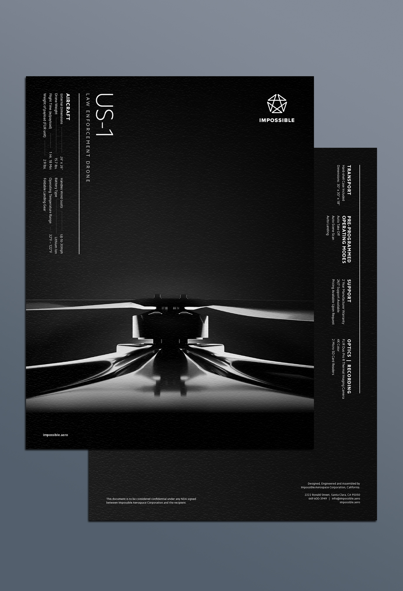 Backed by investors such as Bessemer Venture Partners and Airbus Ventures, Impossible Aerospace is a start-up company based in Sunnyvale, California working to shift aviation from hydrocarbon fuel to electricity. Its first product is a battery-powered drone with two hours of flight time—four times the market standard for electronic aircraft. The Impossible drone—the US-1—is manufactured domestically in the United States, which further differentiates the company in the drone market. Agencies and municipalities across the US are rapidly adopting drone technology to save lives and protect property. Impossible Aerospace, with its American engineering and manufacturing is built to meet—and to become the benchmark for—the high technical standards of the first responder community.
